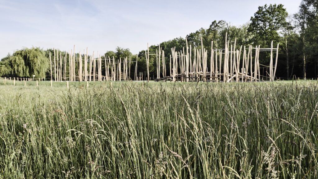 herní prvky umístěné mezi dřevenými kůly, které prostorově vymezují prostor hřiště