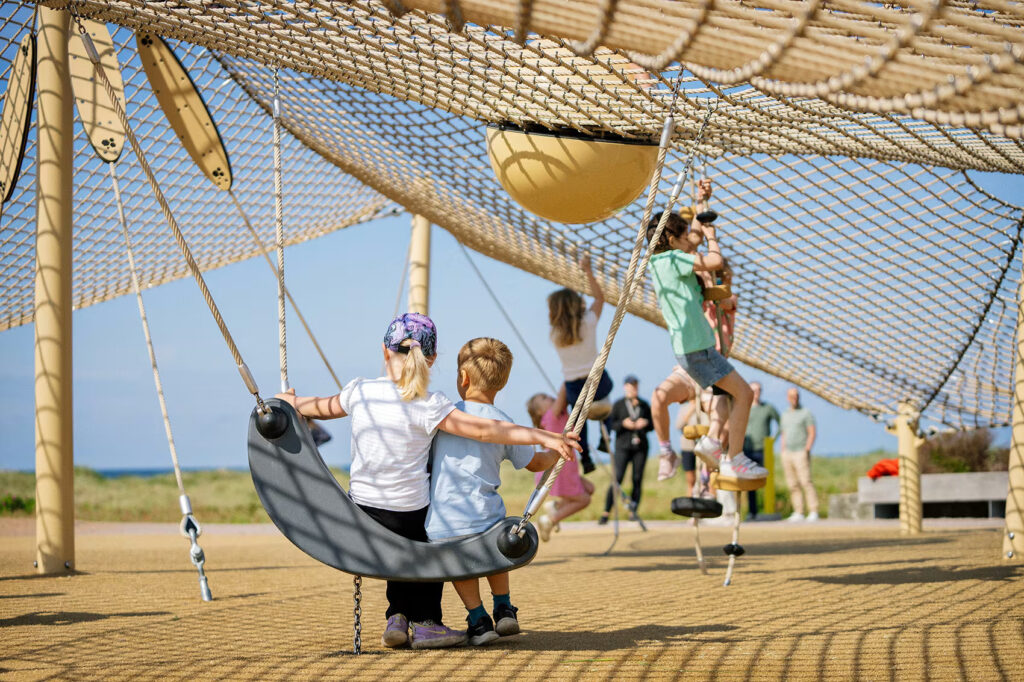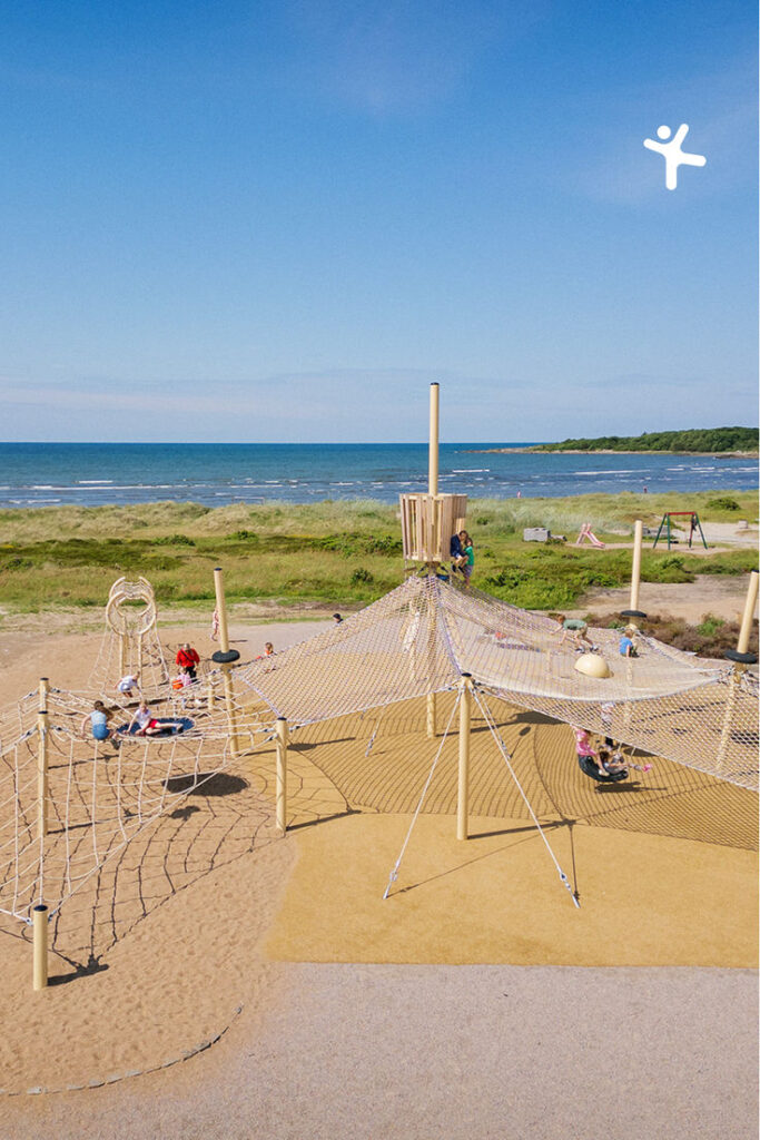 13. [13] s. 22 natažená síť mezi kůly tvoří transparentní prostor a vybízí k interakci (zdroj: https://www.kompan.com/nb/no/planlegging/installasjon-av-lekeplasser )
