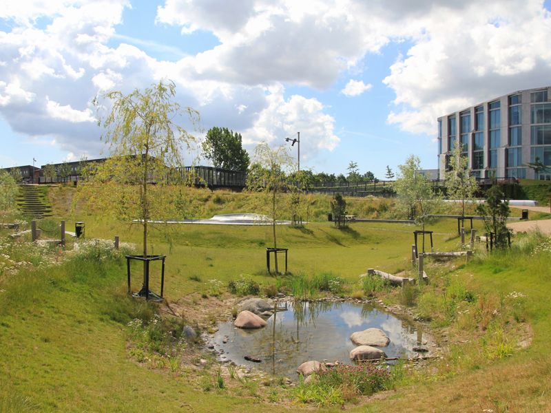 Dešťové vody se budou v parku přirozeně zasakovat. U zpevněných plochy jako jsou stezky pro kolečkové brusle bude použit drenážní asfalt, který propouštěí srážky do podloží, kde se můžou vsakovat. U velkých zpevněných ploch jako je multifunkční hřiště či parkour budou srážky odvedeny do suchého poldru, kde se budou vsakovat.Při větších přívalových deštích by se dočasně v poldru mohla objevit i pozorovatelná vodní hladina. Sledování malého vodního cyklu v krajině má i edukační potenciál.
