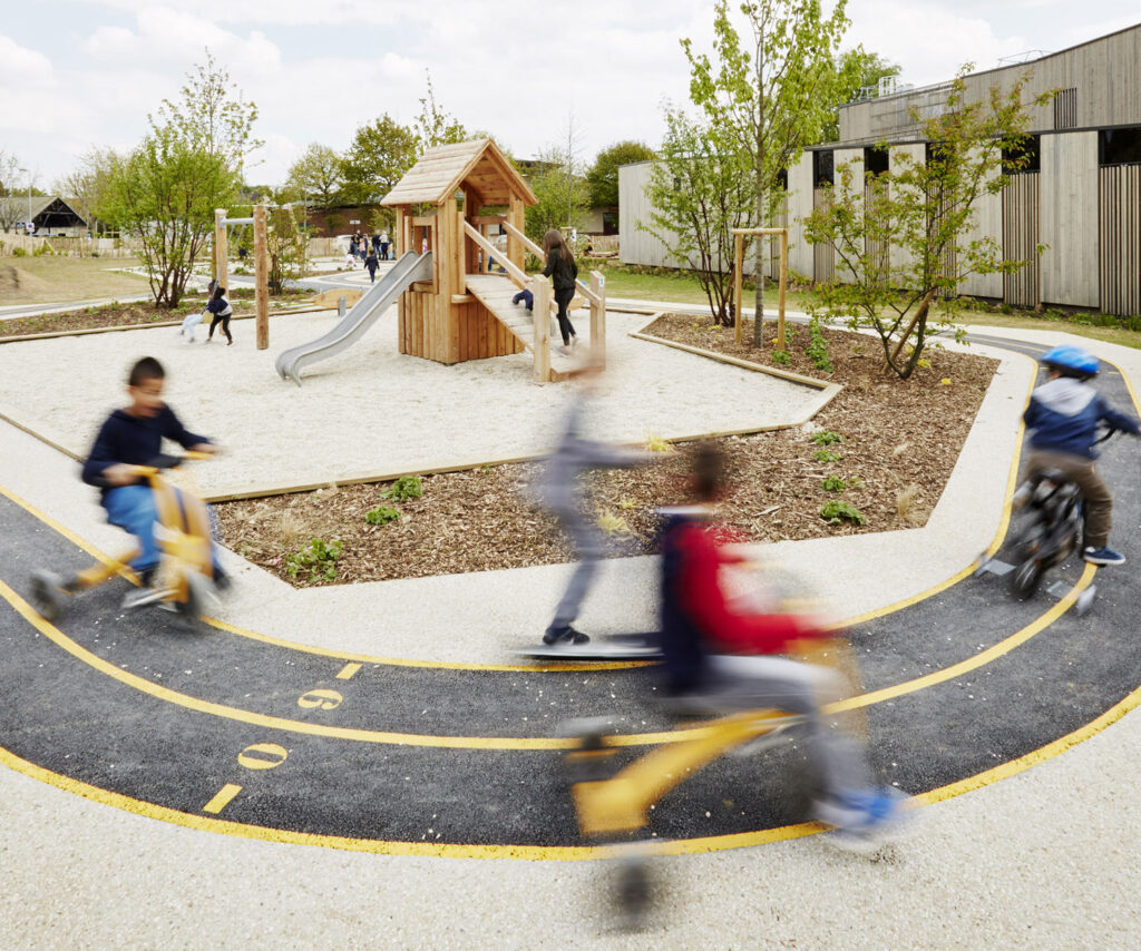 Stávající dětské hřiště doplněné o vyvýšenou hranu oddělující herní prostor a okružní dráhu