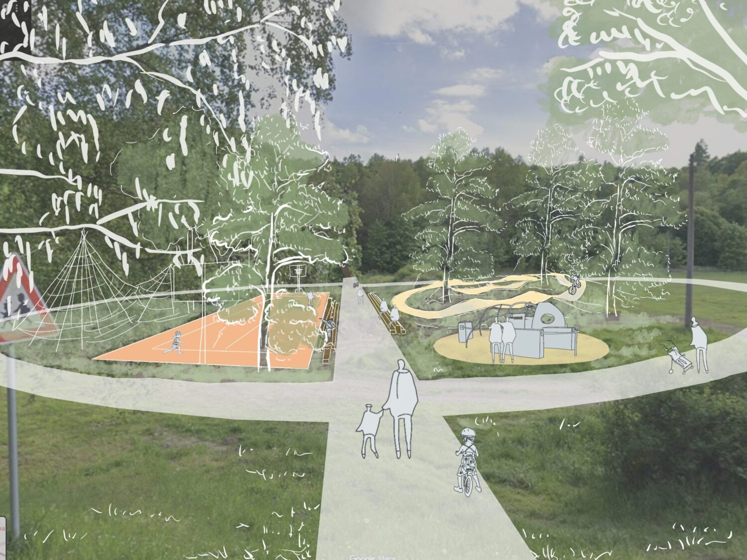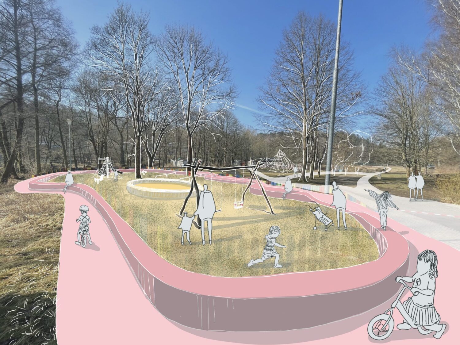 Stávající dětské hřiště by bylo ponecháno a doplněno o pár nových prvků: trampolíny, větší pískoviště. Sloužit bude pro hru a dovádění pro nejmenší děti (věk 3-6 let). Plot okolo něj by byl nahrazen nízkou zídkou, která může sloužit jednak k oddělení prostoru hřiště (místo plotu), ale také k sezení, a díky výškové variabilitě i ke hře. Barevný okruh pro jízdu nejmenších dětí na odrážedlech a kolech kolem hřiště nahrazuje stávající dopravní hřiště a lehce a hravě odděluje hřiště od okolí. Pokud bude potřeba je možné trasu kolem hřiště více zvlnit a přidat křižovatky, tak aby se zde více promítla naučná funkce dopravního hřiště.