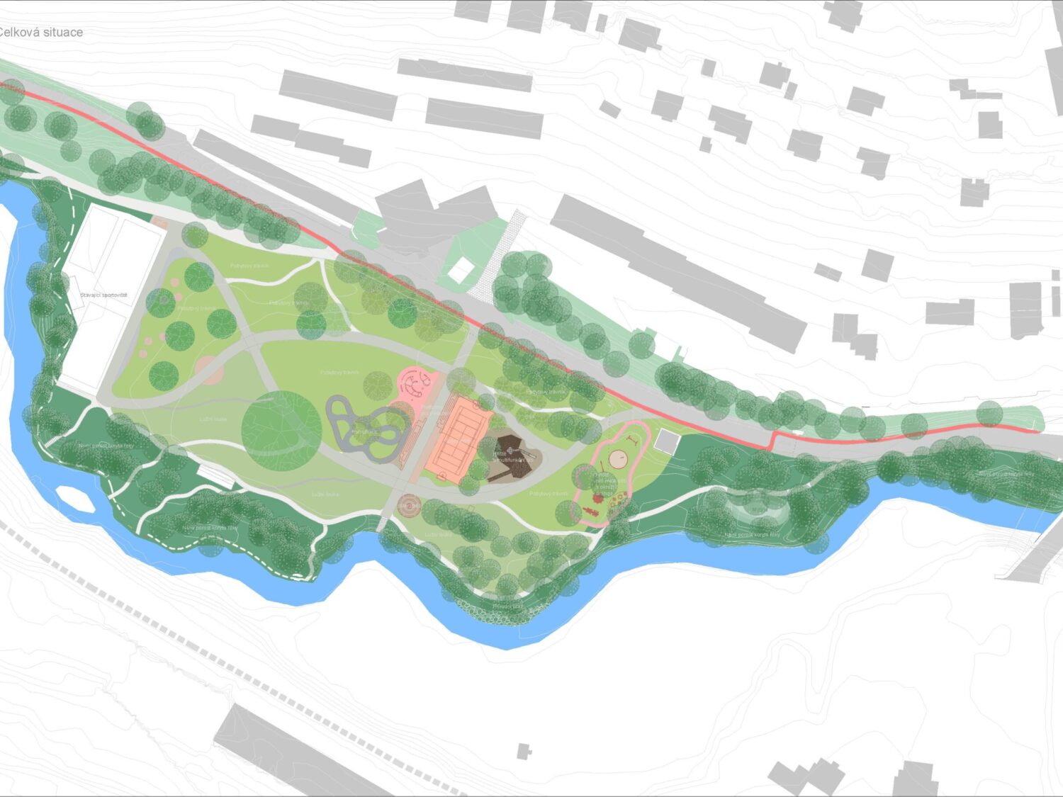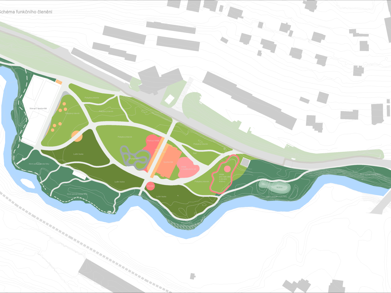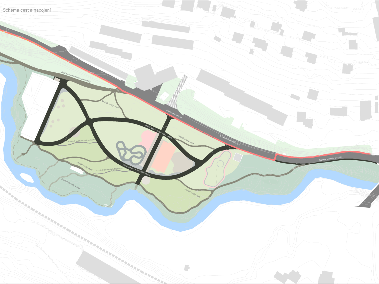 Nová kompozice sportovního parku navazuje na stávající vstupy do území a protíná je dvěma hlavními cestami. První navazuje na komunikaci od panelových domů a navádí návštěvníky přímo k řece. Druhá probíhá podélně celým územím ve smyčce a propojuje jeho začátek a konec, tak aby vznikl uzavřený sportovní okruh pro in-line brusle, běh, cyklistiku, procházky apod. Tyto trasy doplní další mlatové cesty a pěšiny, které protnou území tak, aby reagovaly na možné uživatelské trasy mezi důležitými místy (např. dětské hřiště, sportoviště, přístupy k vodě atd.). Zatímco hlavní trasy by měly mít jasný a čistý průběh, ty vedlejší běžící poblíž řeky, by reagovaly na terén a přírodní charakter svou zvlněností. Cesty by také rozčlenily stávající volnou plochu na segmenty s různými charaktery zeleně i užívání. Najdeme zde jak lužní louku s vysokým porostem, tak nízký pobytový trávník, ovocný sad či hřiště a sportoviště.