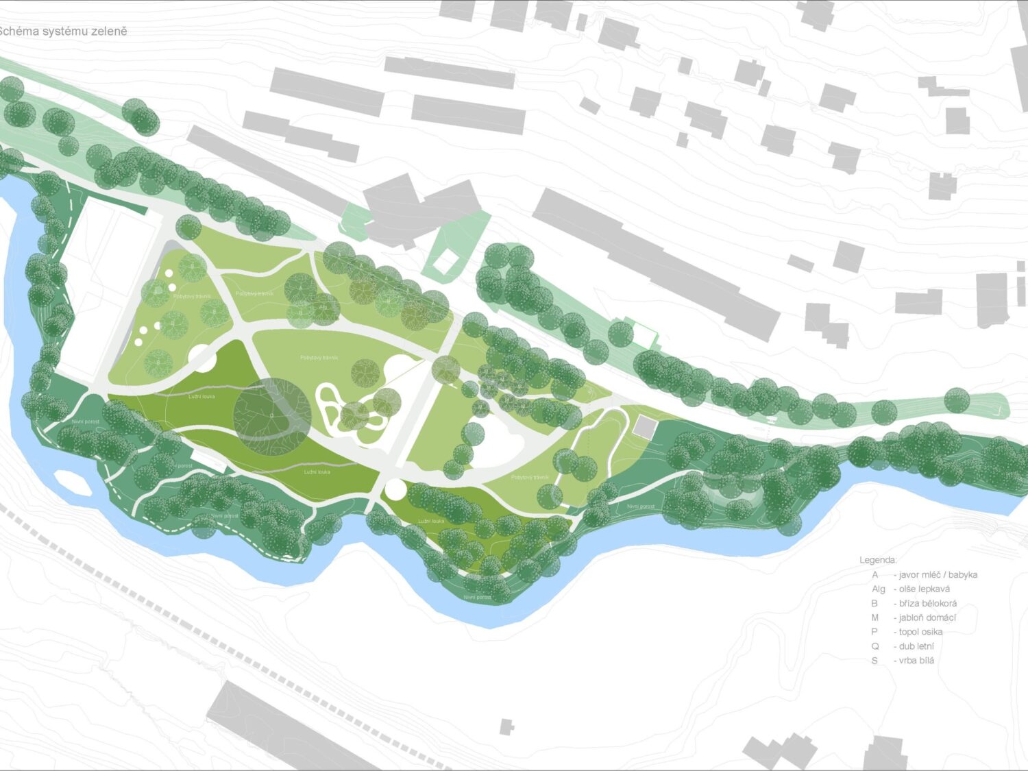 Břehová zóna řeky by bude ponechána spontánní sukcesi, část území s herními a sportovními prvky by pak tvořil trávník, přechodovým prvkem by byla lužní louka.